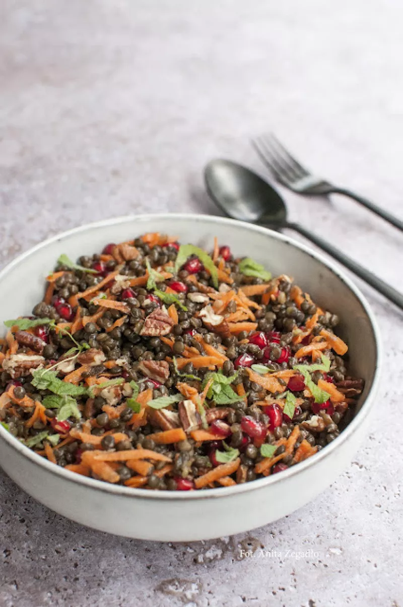 Sałatki z soczewicą to doskonały sposób na zdrowy i sycący posiłek, który jednocześnie jest lekki i kolorowy. Czarna soczewica (beluga) zachowuje swój kształt po ugotowaniu. Jest bogata w białko oraz błonnik. W połączeniu ze słodko-kwaskowymi ziarenkami owocu granatu, chrupiącą marchewką, orzechami i świeżymi ziołami powstaje sałatka, która idealnie sprawdzi się zarówno jako lunch, kolacja, jak i dodatek do dań głównych.To sałatka na jesienno-zimowe dni, kiedy szukamy czegoś sycącego, a jedno...