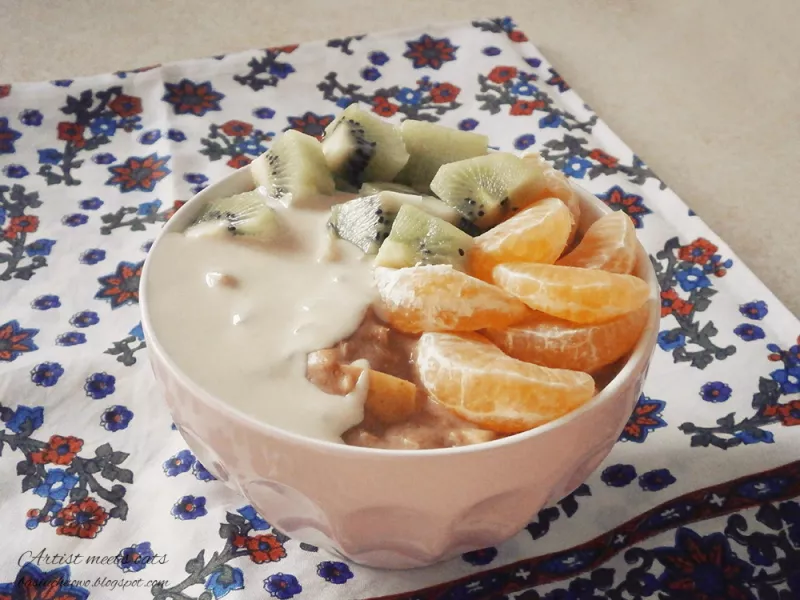 Owsianka gotowana z jabłkiem i cynamonem, podana z mandarynką, kiwi i tahini.