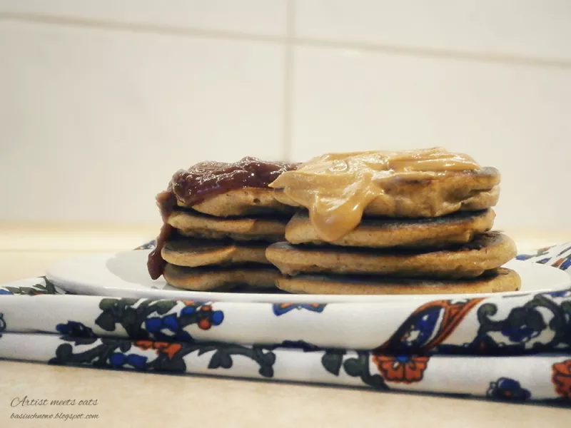 Pełnoziarniste pancakes, podane z masłem orzechowym i powidłami śliwkowymi. Jeszcze tylko weekend i grudzień. Czas pędzi, ale akurat w listopadzie mi to nigdy nie przeszkadzało...w końcu, niedługo będę mogła bezkarnie włączyć swoją świąteczną playlistę na Spotify i podśpiewując pod nosem odliczać dni do świąt :) I do końca tego baaaaardzo dziwnego roku.
