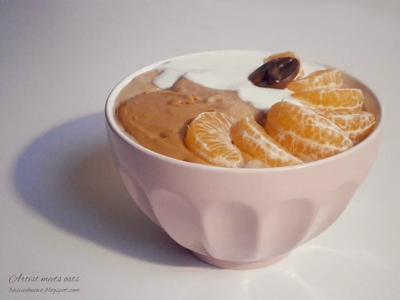 Owsianka cynamonowo - budyniowa, podana z mandarynką, masłem orzechowym, jogurtem naturalnym i czekoladką adwentową.
