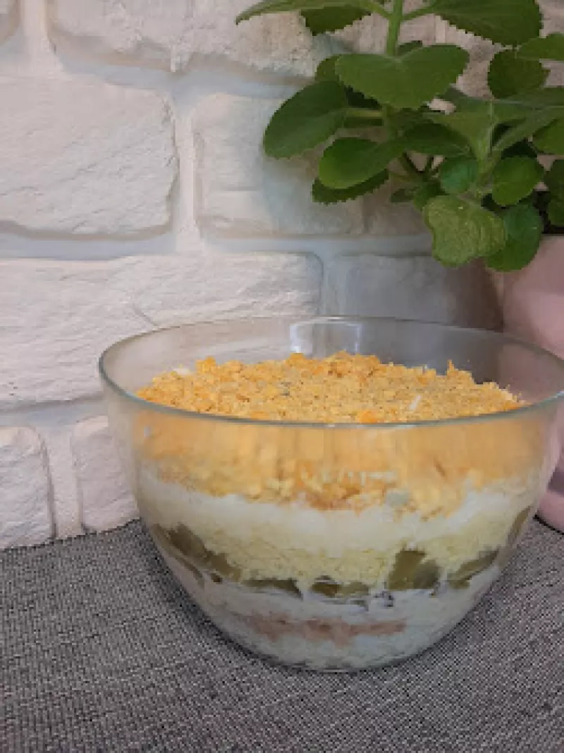 Przepis na warstwową sałatkę, która sprawdzi się na wielu uroczystościach💖Składniki:5 jajek3 ogórki kiszone1 puszka z tuńczyka 170g20 g żółtego sera20 g masła2-3 łyżki majonezuJajka ugotować na twardo. Ogórki pokroić w drobną kostkę a następnie wyłożyć na sitko w celu odsączenia wody. Tuńczyka również wyłożyć na sitko. Żółty ser zetrzeć na tarce o małych oczkach.Ugotowane jajka przekroić, wyjąć żółtka i przełożyć do innej miseczki a białka zetrzeć na tarce o grubych oczkach.Do szklanej salat...