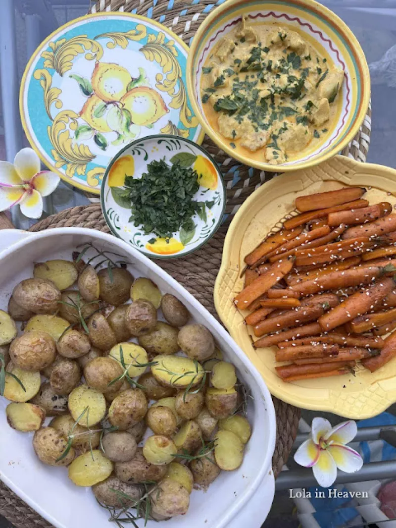 Polecam Wam mój szybki obiad z ostatniego tygodnia. Mówiąc szybki mam na myśli gotowanie i pieczenie w tym samym czasie. Gorąco Was zachęcam do tego typu czynności, który wielokrotnie ratowały mój cenny czas przed pracą. W czasie gotowania ziemniaków i kurczaka w sosie, wrzuciłam do piecyka młode, chrupiące marchewki, dzięki czemu mogłam podać coś prostego, a jednocześnie niebanalnego.Do zestawu obiadowego wybrałam nieduże ziemniaki, które najpierw ugotowałam w łupinach, a następnie krótko ...