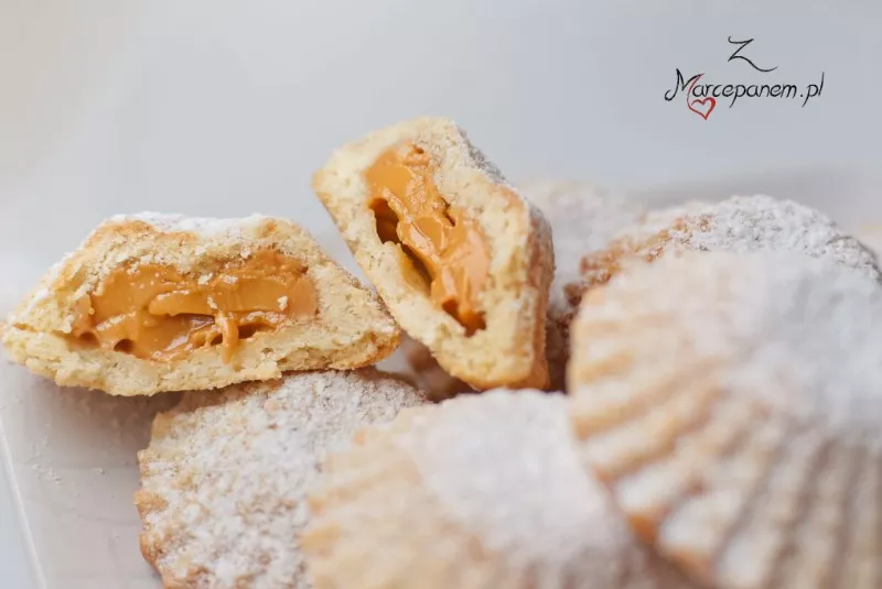 Kruche babeczki z nadzieniem kajmakowym to pozycja dla amatorów prawdziwych słodkości. Babeczki są na prawdę słodkie, ale przy tym pyszne. Kruche ciasto rozpływające się w ustach z delikatnym słodkim kajmakowym wnętrzem zaspokoi chęć na słodycze i będzie pysznym dodatkiem do popołudniowej kawy. Inna wersja babeczek to babeczki z budyniem – równie smaczne jak kajmakowe. SKŁADNIKI: 300 g mąki pszennej ( 2 szklanki) 120 g masła 1/2 szklanki cukru 1 jajko 2 łyżeczki zsiadłego mleka lub śmietany n...