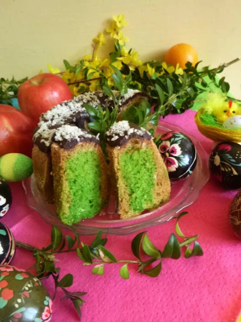 Babka majonezowa Zielona łąkaSkładniki:pół szklanki mąki pszennejpół szklanki mąki ziemniaczanej4 jajka5 łyżek majonezupół szklanki cukru2 łyżki proszku do pieczenia1 kropla barwnika zielonegoWykonanie:Cukier z jajkami ubić mikserem.Dodać majonez.Wsypać przesiane mąki z proszkiem do pieczenia, całość wymieszać, powoli.Podzielić ciasto na dwie części, jedną cześć wymieszać z barwnikiem , drugą pozostać bez zmian.Do foremki wlać pierwszą część ciasta, następnie drugą część ciasta. Gotowe ciasto...