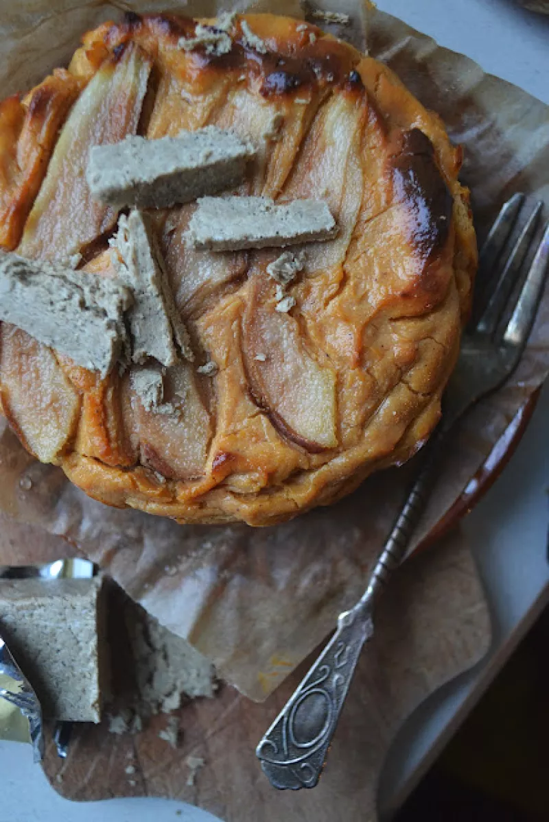 Batatowy pieczony tofurnik, z chałwą słonecznikową i gruszką Ta chałwa to moje dzisiejsze odkrycie dnia, niech cały dzień będzie taki pozytywny ^^ Jeszcze tylko kilka(nascie) godzin