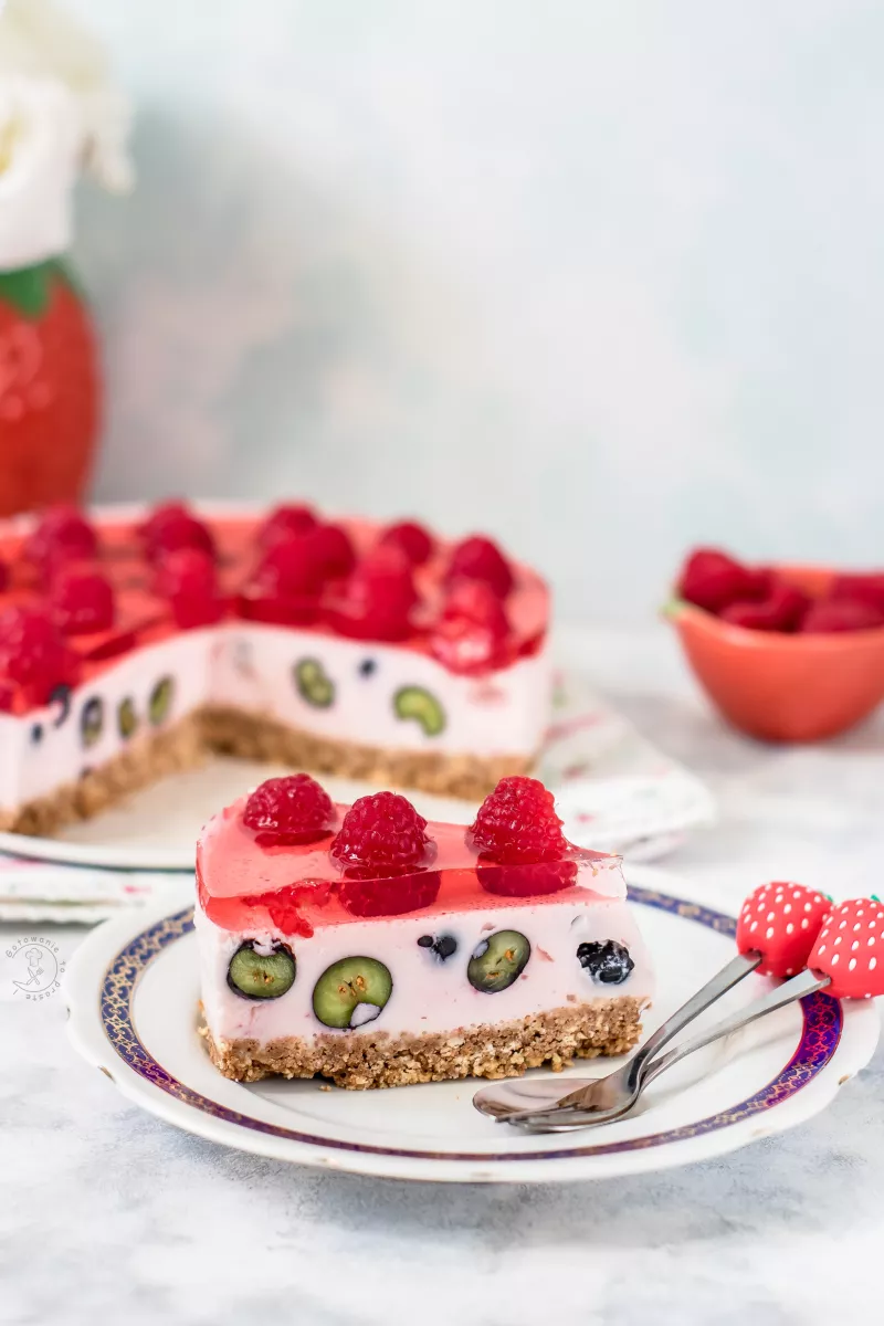 Kolejne bardzo proste i bardzo smaczne ciasto owocowe, idealne na letnia pogodę. Można by powiedzieć że Fit gdyby nie to że skyry są słodkie, a galaretki również ;) Za to możecie użyć skyr naturalny i galaretki ze zmniejszoną ilością cukru i ciasto staje się mniej kaloryczne ;) Składniki na tortownicę 18 cm: spód:110 g herbatników70 g roztopionego masła masa:2 jogurty typu Skyr Waniliowe po 150 g1 galaretka truskawka-kiwi + 400 ml wodyduża garść borówek na górę:1/2 galaretki malinowej lu...