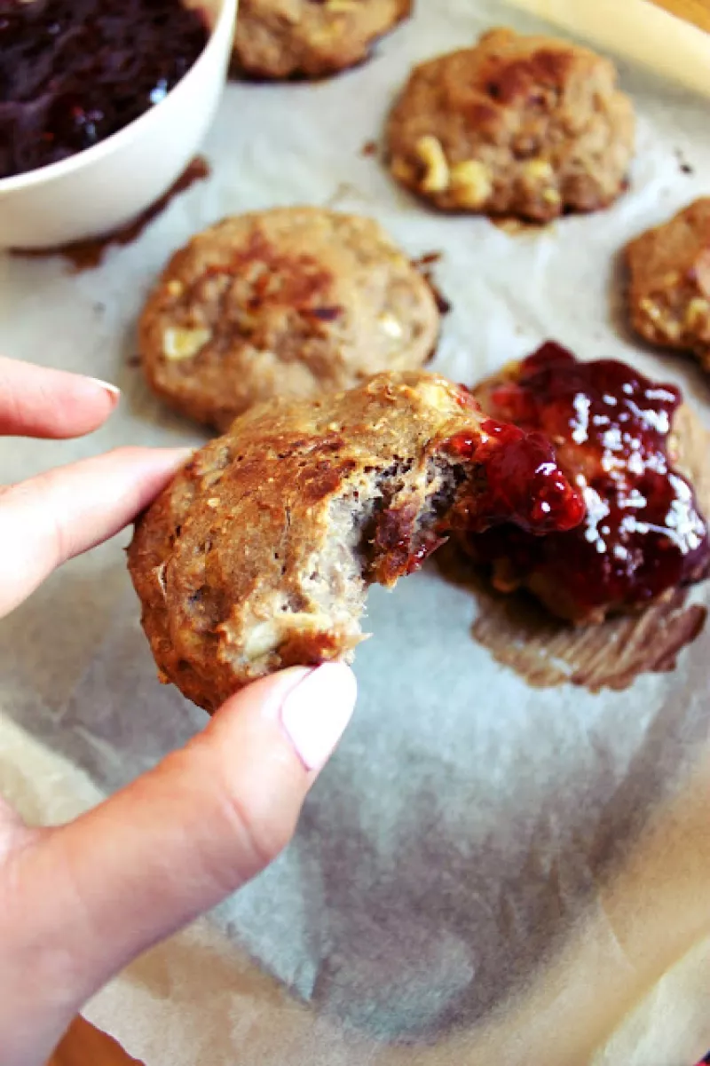Hej! Jaka pogoda w Polsce? u mnie nawet słonecznie. Wstałam dzisiaj i uświadomiłam sobie: 20 dni do ślubu!!! Głęboki wdech i wydech. Będzie dobrze. A co by o tym nie myśleć podwinęłam rękawy i wyczarowałam bułeczki, przy których zapomniałam nawet o ślubie ;) Chodzą pogłoski, że istnieją kobiety które nie lubią gotować i piec... Wdech i wydech... Na szczęście mi to nie grozi!!! :) Składniki na ok 6 - 8 bułeczek 2 banany 1 szklanka mąki pełnoziarnistej 1 jajko Odrobina pokruszonych drożdży zala...