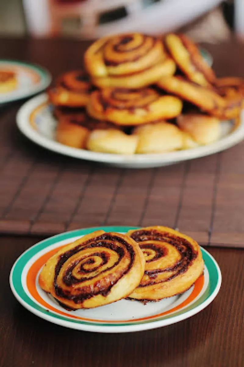 SKŁADNIKI: Ciasto: 1 szkl. mleka 2 jajka 1 żółtko 6 łyżek cukru 125 g masła (1/4 kostki) szczypta soli 4 szkl. mąki 7 g drożdży suchych (jedno opakowanie) Nadzienie: 70-100 g masła 20-30 g cynamonu 2 łyżki cukru waniliowego 1/2 szkl. brązowego cukru opcjonalnie łyżeczka kardamonu PRZYGOTOWANIE: Do ciepłego mleka dodajemy drożdże i cukier, mieszamy do rozpuszczenia cukru. Odstawiamy na kilka minut w tym czasie do miski przesiewamy sól i mąkę, dodajemy jajka, mleko z drożdżami i ugniatamy. W...