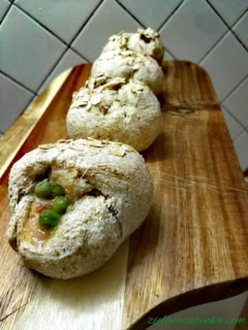 Bułeczki razowe nadziewane, wędliną, groszkiem i serem