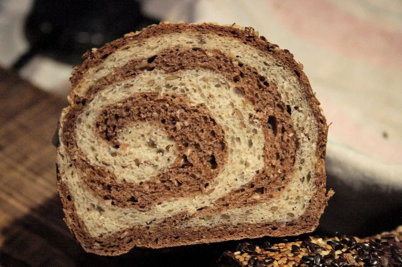 Bardzo widowiskowy wypiek! Przypomina jakieś słodkie, zrolowane ciasto, lecz w smaku podobny jest do chleba Polskiego, tylko brak w nim charakterystycznego kwaśnego posmaku, jaki daje zakwas żytni. Bałam się, że kakao w ciemnym cieście będzie wyczuwalne, jednak nie-dominuje kminek. Jeśli nie przepadacie za jego intensywnym aromatem, radzę zmniejszyć jego ilość. Jest to bardzo łatwy i szybki chleb, który na pewno zachwyci każdego swoim wyglądem! Przepis znalazłam na blogu I Adore Cinnamon Chle...