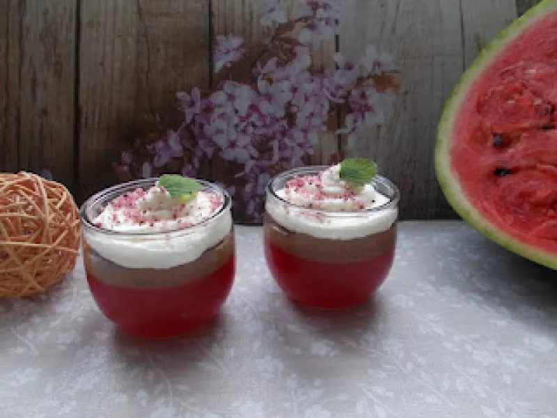 Zapraszam na pyszny deser na zimno. Połączenie lekkiej galaretki arbuzowej z musem czekoladowym idealnie do siebie pasuje. Do tego ubita śmietanka i można zajadać. PolecamSkładniki:500 g arbuza (bez skórki i pestek)2 galaretki arbuzowe (na 375 ml)mus czekoladowy: 1 szkl śmietanki 30%100 g czekolady gorzkiej1 cukier waniliowy3 łyżki cukru pudru1 łyżeczka pasty waniliowejoraz: 3/4 szkl śmietanki 30%1 łyżka cukru pudruPrzygotowanie:Galaretki rozpuszczamy w 1,5 szklanki gorącej wody i odstawiamy...