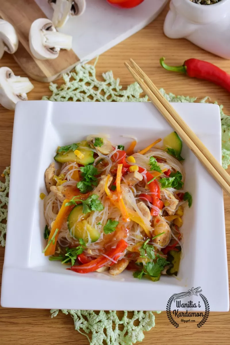 Są takie dania które zje się raz, a potem przez lata powracają, bo każde wspomnienie sprawia, że kubki smakowe pracują na wysokich obrotach J takim daniem jest domowa chińszczyzna makaronem ryżowym i warzywami. Robi się szybko, jest słodko-pikantne i charakterne. Bogate w smaku i po prostu uzależniające. Prosta wersja chińszczyzny jaką można zrobić w domowej kuchni. Składniki: 20 dag makaronu sojowego 1 podwójna pierś z kurczaka 1 papryka czerwona 1 duża marchewka ½ cukinii 6 świeżych...