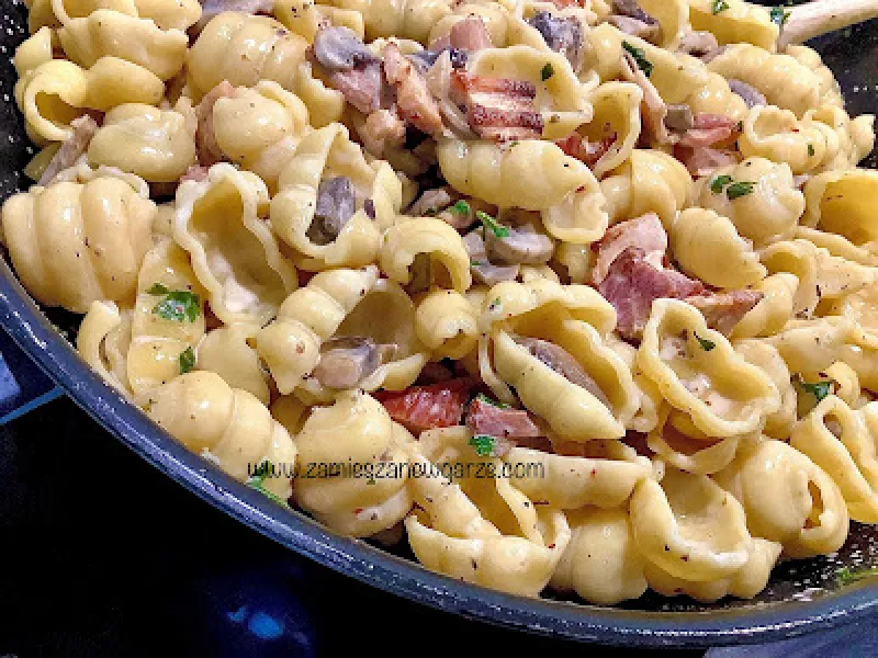 Jak nie mam czasu i brak pomysłu na obiad to za zwyczaj robię prosty makaron z przeróżnymi dodatkami i sosami.Taki makaron zawsze i wszędzie się sprawdzi i wszyscy chętnie zjedzą - nie ma opcji żeby nie smakowało, a dodatki zazwyczaj to tzw „sprzątanie lodówki” u mnie się nic nie marnuje 😉Składniki:1 opakowanie makaronu - 500 g500 g pieczarek 1 średniej wielkości cebula3 ząbki czosnku 1 duża łyżka posiekanej natki pietruszki 300 g wędzonego, surowego boczku 200 ml Śmietanki 30%1 łyżka oliwy...