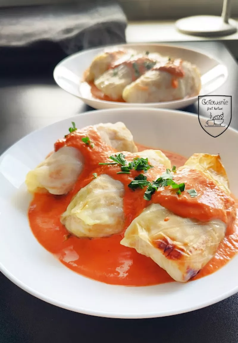 SKŁADNIKI: 1 główka kapusty (zwykłej białej lub "na gołąbki") NADZIENIE: 1 szklanka ryżu białego (przed ugotowaniem)650g mięsa mielonego wieprzowego (łopatka, szynka, mieszane) 2-3 łyżeczki koncentratu pomidorowego sól, pieprz czarny mielony, pieprz ziołowy SOS:1 puszka krojonych pomidorów lub pulpy pomidorowej250 gramów śmietany 18% lub 12% koncentrat pomidorowy (według uznania)1 średnia cebula s...