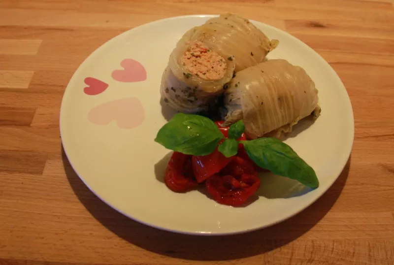 gołąbki z kapusty pekińskiej z mięsem z indyka i pomidorami suszonymi
