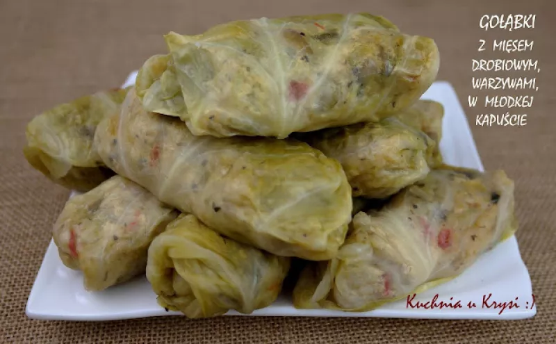 Gołąbki z mięsem drobiowym i warzywami w młodej kapuście