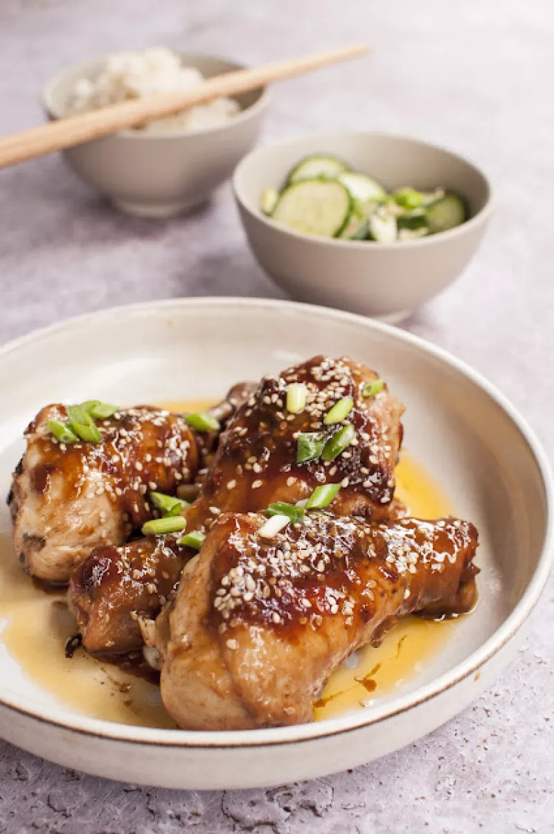 Ten kurczak to coś dla fanów kuchni azjatyckiej. Lekko ostry, błyszczący, z głębokim smakiem sosu sojowego, chili i imbiru. Idealny z ryżem jaśminowym lub basmat i sałatką z ogórków. To przepis, który z pozoru wygląda na skomplikowany, ale wszystko przygotujesz w 40-45 minut.Składniki: 6 nóżek kurczaka2 łyżki mąki ziemniaczanej1/2 szklanki oleju kuchennegosos1 łyżka sosu sojowego1/2 łyżki brązowego cukru1 łyżka koreańskich płatków chili lub gochugaru2 łyżki mirinu2 łyżki piwa imbirowego1 łyże...