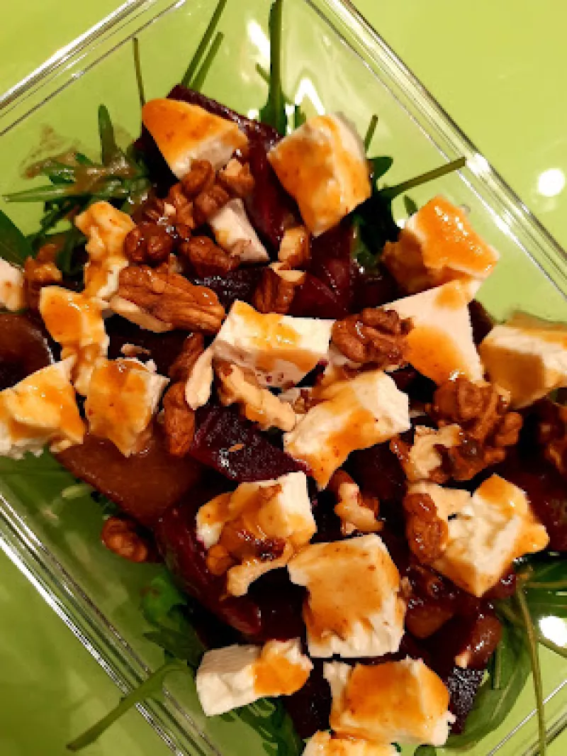 Pyszna sałatka z kurczakiem w chrupiącej panierce, roszponką, serem z niebieską pleśnią i sosem mio…