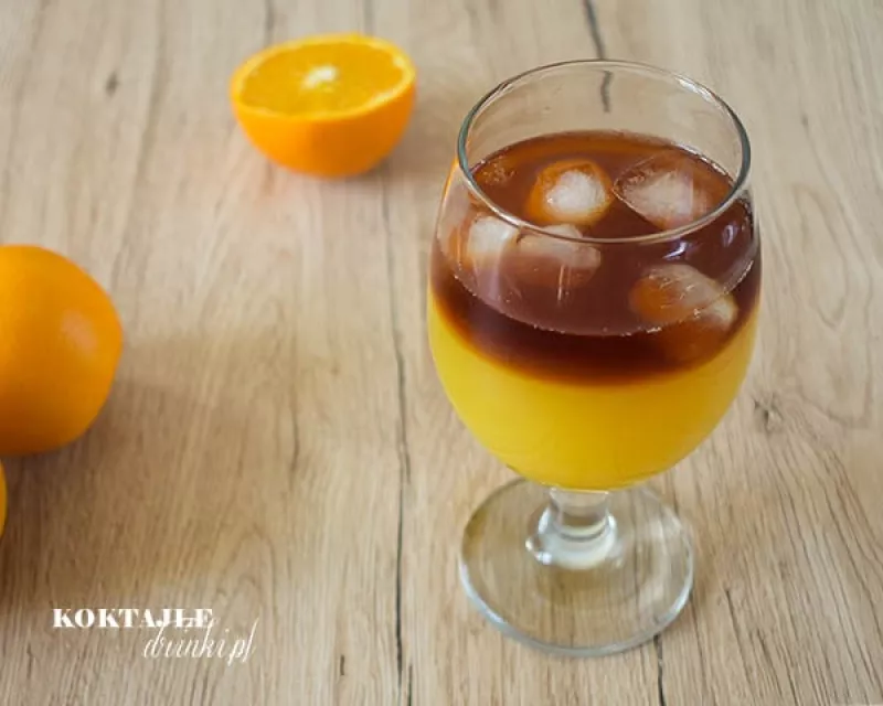 Przepis na drink oprócz Jagermeistera zawiera słodki wermut martini. Wlewając na samym końcu Jagermeister tworzymy drugą warstwę kontrastującą z sokiem pomarańczowym.