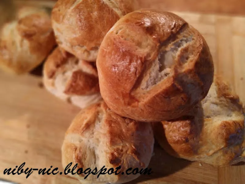 Najlepsze świeże. Na drugi dzień nie są już tak dobre. Znajoma poleca zamrozić i odgrzać na patelni, by były takie jak świeże. Przepis mam od Renaty, która znalazła go na stronie Moje Wypieki. :) Potrzebujemy (10szt.): - 450g mąki pszennej, - 3/4szkl letniej wody, - 12g świeżych drożdży, - 1,5 łyżeczki cukru, - 1 łyżeczka soli, - 1 jajko, - 2 łyżki roztopionego masła. Wszystkie składniki oprócz roztopionego masła umieścić w misie TM, 2min/interwał. Po tym czasie dodać roztopione masł...