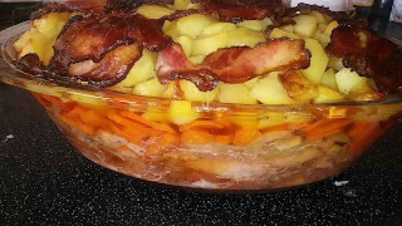 Składniki: - ok. 600g karkówki wieprzowej - 2 cebule - ok. 10 plastrów boczku wędzonego - 3 duże marchewki - ok. 10 średnich ziemniaków - 3 łyżki oleju - przyprawy: papryka słodka i ostra, sól, oregano, tymianek Sposób przygotowania: 1. Z oleju i przypraw zrobić marynatę i nasmarować nią pokrojoną w plastry karkówkę. 2. Cebulę kroimy w piórka, marchew- w plastry, ziemniaki- w pół plastry. 3. 2 plastry boczku pokroić w drobną kostkę i podsmażyć na nim cebulę 4. W naczyniu żaroodpornym ułożyć k...