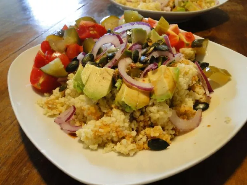 Kasza jaglana z awakado, czerwoną cebulą i sałatką pomidorowo-ogórkową