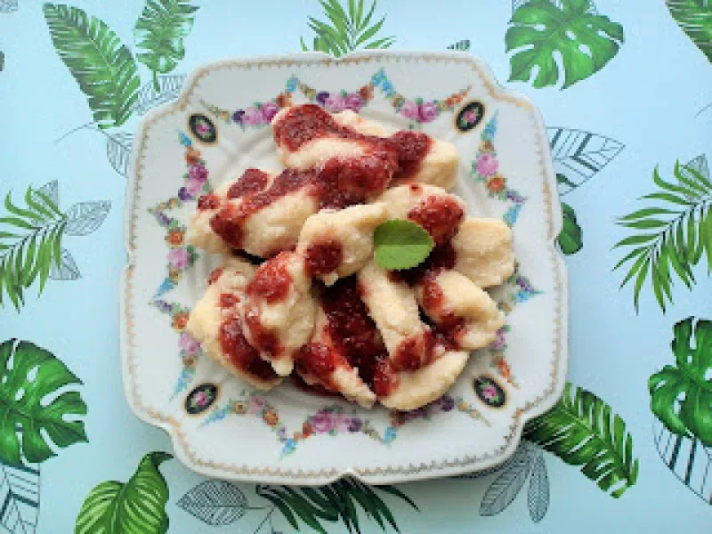 Kluski jogurtowe z domowym sosem truskawkowym