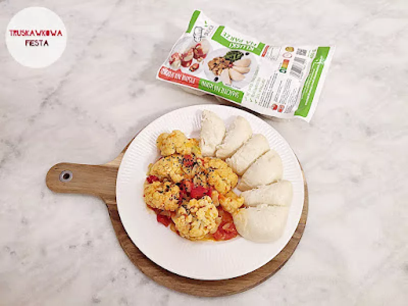 Bez mięsne danie, ale za to z dużą ilością warzyw. To wszystko podane z kluskami od Buchcik!Składniki:200 g klusek na parze200 g kalafiora100 g puree z dyni50 g cebuli białej150 g pomidorkówprzyprawy: sól, pieprz, czosnek granulowany10 ml oleju do smażeniaSposób przygotowania:Kalafior umyć, podzielić na mniejsze różyczki. Wrzucić do wrzącej, osolonej wody i gotować 10 minut. Między czasie kluski przygotować zgodnie z instrukcją podaną na opakowaniu. Cebulę obrać i pokroić w drobną kostkę. Pom...