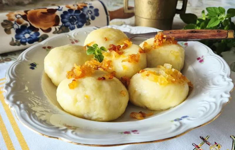 Proponujemy dzisiaj proste kluski z ciasta ziemniaczanego, z którego robimy między innymi kluski śląskie i farszu mięsnego, drobiowego gotowanego (najlepiej z mięsa z rosołu). Mięso z rosołu możemy wykorzystywać do pierogów, krokietów, pasztetów, zapiekanek ale też do takich prostych klusek jak nasze. Kluski są mięciutkie, polane okrasą ze zrumienionej na maśle cebulki smakują wybornie. Ciasto wyrabia się błyskawicznie i prosto według stałych proporcji. Kluski możemy nadziewać dowolnymi farsz...