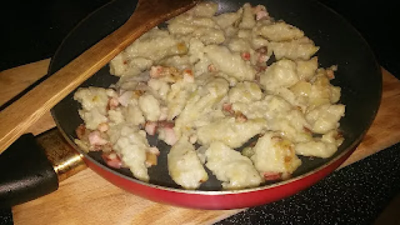 Składniki: - ok. 15 sporych ziemniaków - 1-1,5 szklanki mąki pszennej - 2 jajka - 2 łyżki oleju rzepakowego - 4 plastry boczku - pół cebuli - przyprawy: sól Sposób przygotowania: 1. Ziemniaki obieramy i ścieramy na drobnych oczkach. 2. Do ziemniaków dodajemy mąkę, sól i jajka. Łączymy składniki. 3. W garnku gotujemy wodę z dodatkiem soli i oleju. Dzięki olejowi nie będą się sklejać. 4. Kluski wrzucamy na wrzątek i gotujemy 5 minut od wypłynięcia. Odcedzamy. 5. Boczek i cebulę kroimy w kostkę....