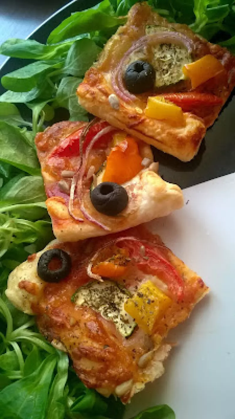 Kolorowo zrobiło się na talerzu :) Te kolorowe kwadraciki, przypominające mini kanapeczki są dobrym pomysłem na ciepłą przystawkę. Najlepsze w nich jest to - że tak naprawdę możemy na nich umieścić wszystko to co lubimy lub to co akurat mamy w lodowce :) Są świetne - gdy zaskoczą nas niezapowiedziani goście gdyż ich przygotowanie trwa dosłownie kilka chwil. 1 opakowanie ciasta francuskiego ketchup ser tarty mozzarella czerwona cebula kolorowe papryki: czerwona, żółta, pomarańczowa czarne oli...