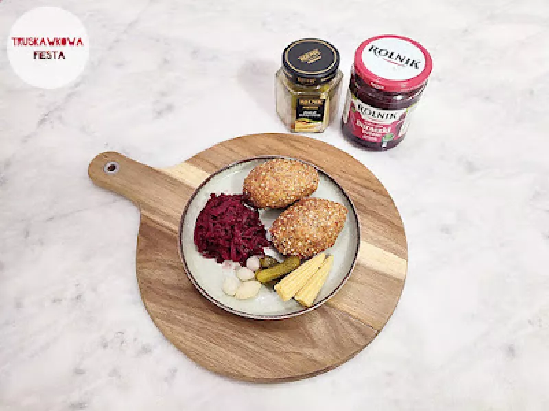 Kotlety mielone wieprzowe z kaszą gryczaną białą, piklami warzywnymi i buraczkami