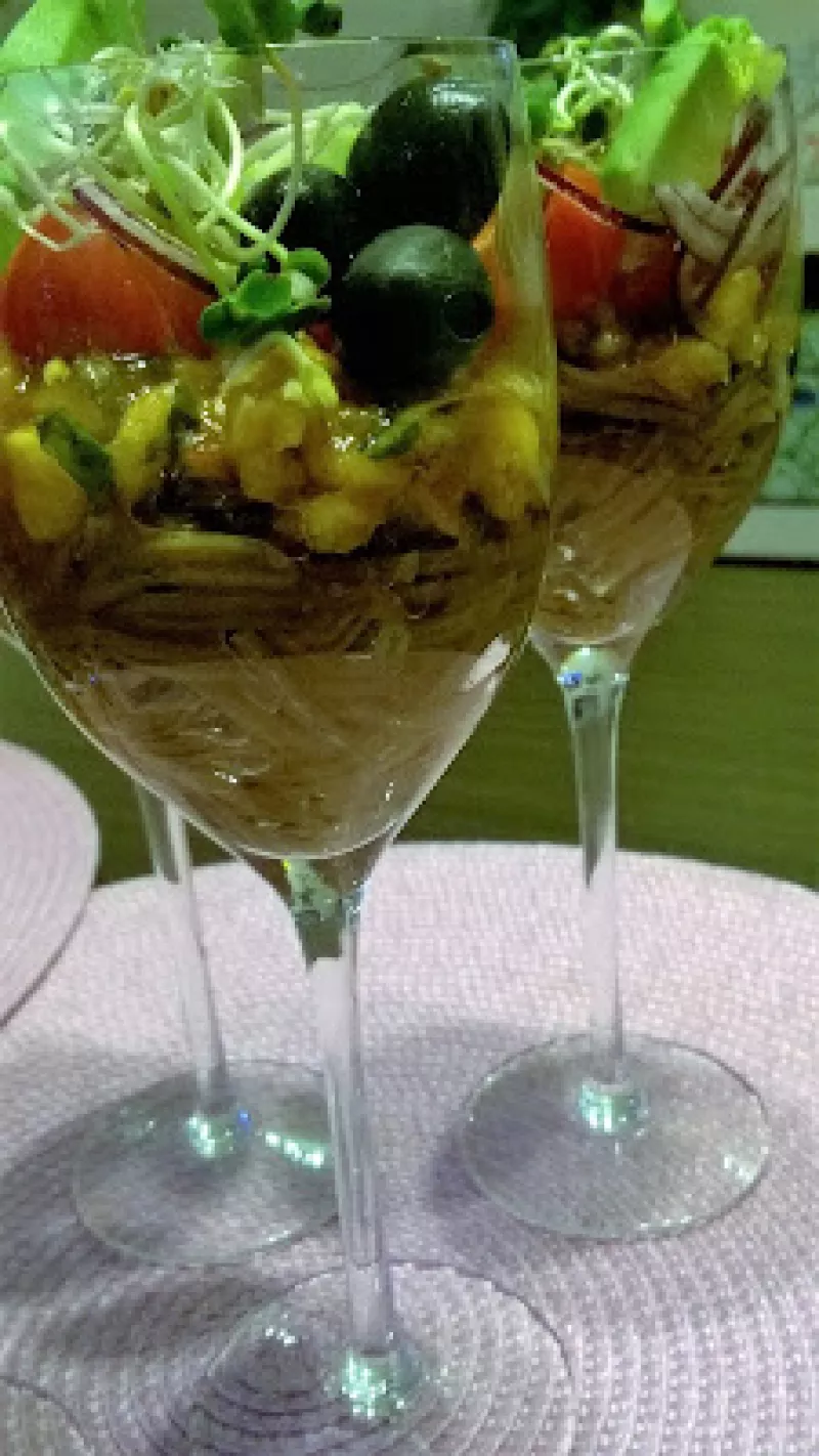 Dzisiejszy post jest postem ... nr 100 :) Aby to uczcić weźmy kielichy w dłoń ! Nie byle jakie - bo wypełnione samymi dobrociami. Składniki: 100 g makaronu Soba Noodle 200 g krewetek koktajlowych 1 łyżka oleju kokosowego 4 ząbki czosnku zielona pietruszka sos sojowy sos chili słodki 10 pomidorków koktajlowych pół awokado pół czerwonej cebuli 12 czarnych oliwek kiełki rzodkiewki Przygotowanie: Przygotowujemy 4 kieliszki (do wina). Makaron Soba Noodle - cienki brązowy makaron z mąki gryczane...