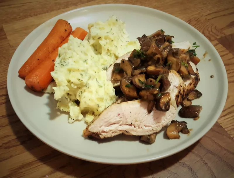 Długi czas nie mogłem znaleźć inspiracji na zrobienie jakiegoś nowego dania. Nie chciałem po raz kolejny robić wołowiny albo kaczki, a wieprzowiny żona nie lubi. Dlatego trzeba było coś wykombinować z kuraka. Wyszło naprawdę spoko! Bez zbędnego pitolenia, od razu przechodzę do przepisu: Składniki (dla dwóch osób): dwie małe piersi z kurczaka 50g masła 250g pieczarek brunatnych natka pietruszki 100-150 ml wermutu łyżka stołowa musztardy dijon duży ząbek czosnku sól, pieprz Temat zaczynamy od n...