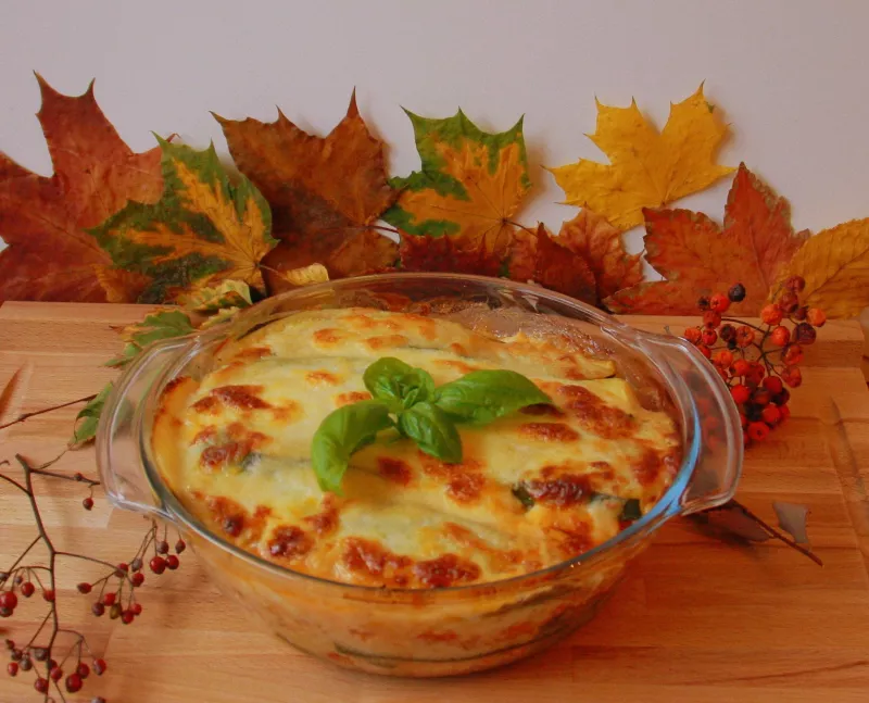 lasagne z cukinii z mięsem z kurczaka i odchudzonym beszamelem.