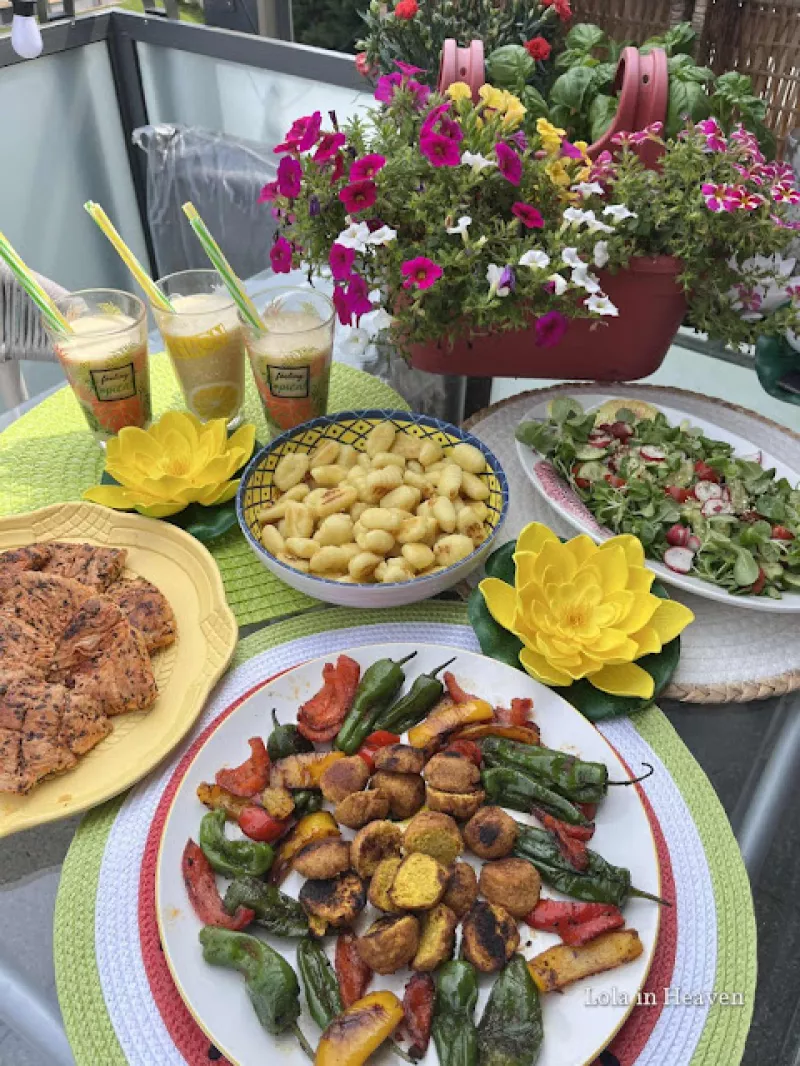Dobrze, że nieubłaganie zbliżająca się jesień przyniesie barwne dary natury, bo chyba magii kolorów na letnim stole będzie mi najbardziej brakować.Przy odrobinie wysiłku zawsze udało mi się stworzyć aranżację stołu, która będzie doskonałym podsumowaniem letnich klimatów. Możecie podobne dania wykonać w okresie jesiennym, a wówczas grillowane warzywa czy mięso umieścicie w piecyku. Nie byłabym sobą, gdybym nie dorzuciła orientalnego elementu( falafel). Jeśli mnie obserwujecie, to zauważyliści...