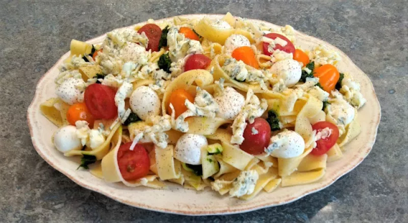 Makaron z dobrymi dodatkami, zawsze smakuje wyśmienicie... -- Skład: makaron szlachecki 400 g, ser mini mozzarella 150 g, ser pleśniowy Blue 100 g, pomidorki koktailowe 10-15 szt. , pesto tradycyjne lub jak u mniepesto z czosnku niedźwiedziego ~4 łyżeczki., sól i pieprz wg. uznania *** Dziękuję Ci bardzo J.J. za przesłanie mi tego fajnego pesto :) Makaron gotujemy aldente wg zaleceń, potem przelewamy ciepłą lub zimną wodą-zależy jak chcemy podać, ser ucieramy lub kroimy w paseczki , pomidor...