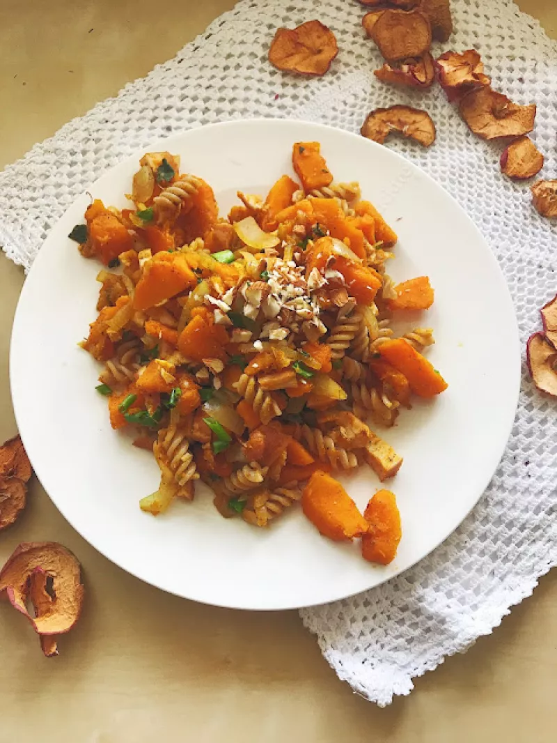 Makaron z dynią i wędzonym kurczakiem