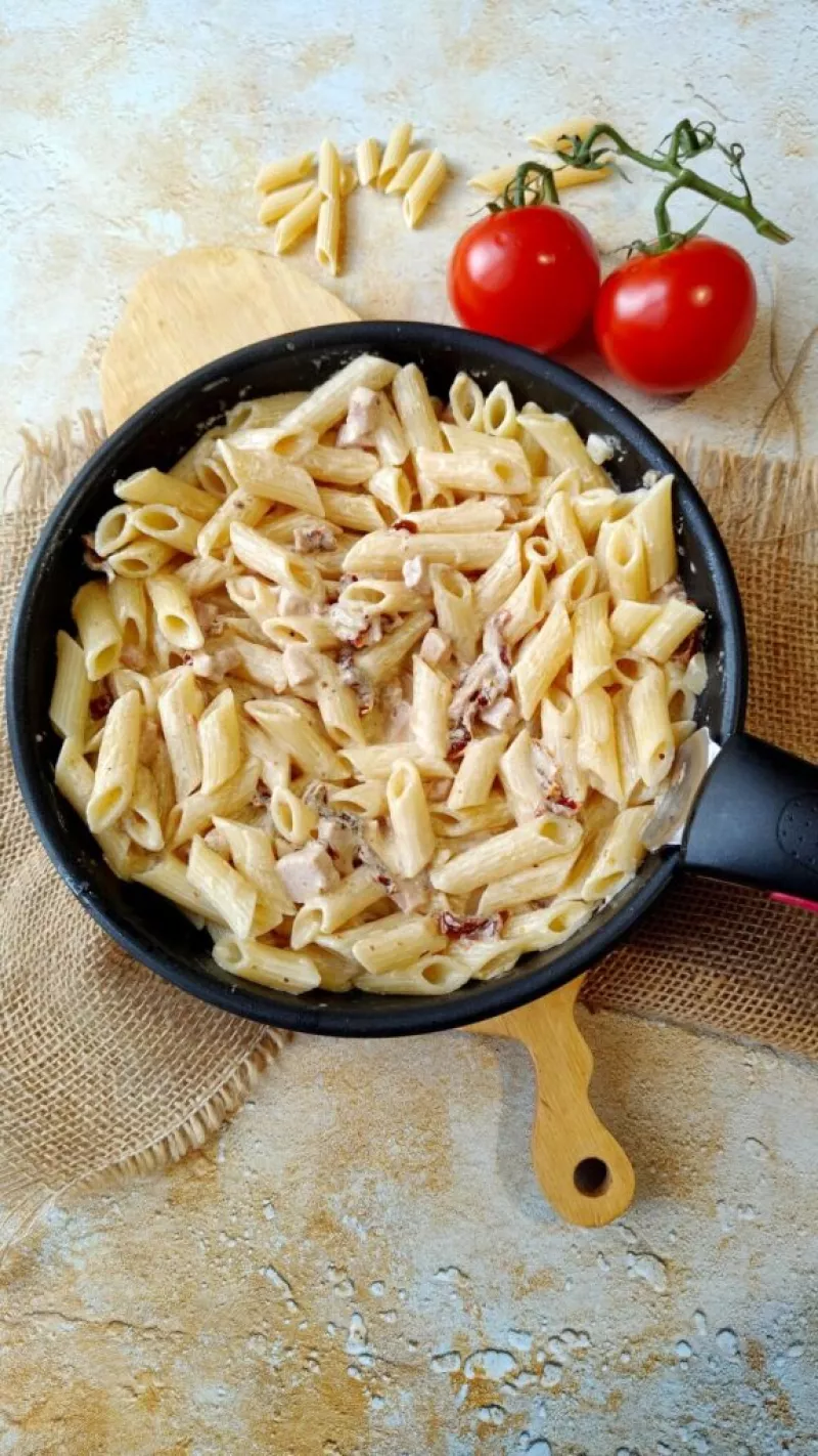 Źródło: https://www.slodkieokruszki.pl/makaron-z-szynka-i-suszonymi-pomidorami-obiad-w-20-minut