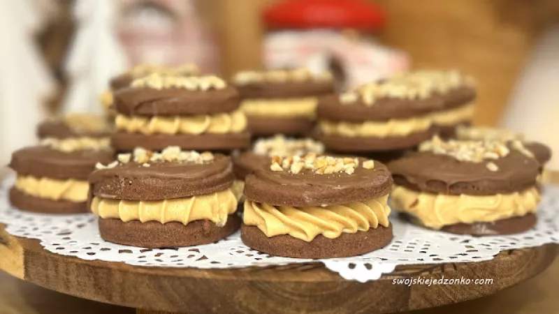 Pyszne kruche ciasteczka, z kremem maślano-kajmakowym, do tego mleczna czekolada i orzeszki. Mniam... polecam...Zobacz przepis »