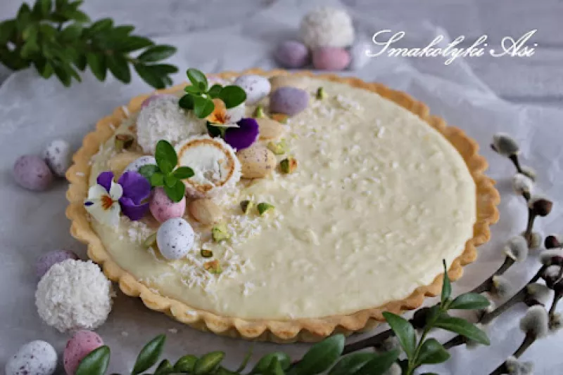 Delikatny, kruchy spód z czekoladowo-kokosowym kremem to pomysł na przepyszny wielkanocny mazurek.Ciasto kruche:150 g mąki pszennej50 g mąki ziemniaczanej100 g masła w temp. pokojowej50 g cukru pudrujajkoKrem:400 ml śmietanki 30%300 g białej czekolady100g wiórków kokosowychDekoracja:praliny rafaellomigdałyczekoladowe jajeczkaCiasto kruche: Wszystkie składniki przełożyć do miski, zmiksować a następnie zagnieść gładkie ciasto. Ciasto zawinąć w folię i schłodzić godzinę w lodówce. Cienko rozwał...