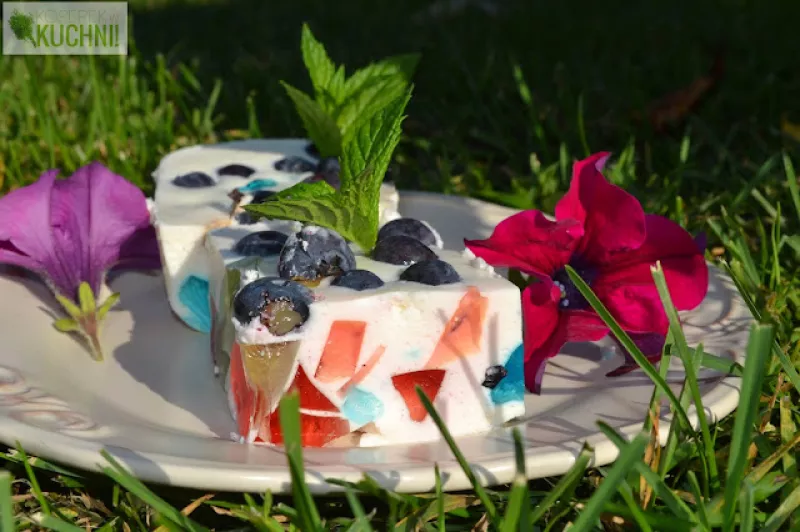 Uwielbiam ciasta na zimno, z galaretką szczególnie :) Te jest łatwe i baardzo smaczne ! :) Składniki: 800 ml śmietany 18% 1 szklanka cukru pudru 5 łyżeczek żelatyny 200 ml wody 3 galaretki najlepiej o róznych kolorach( ja użyłam niebieskiej,czerwonej i zielonej) świeże owoce na wierzch ( ja miałam borówki,mogą być maliny lub jagody) Przygotowanie : Kilka godzin wcześniej przygotować galaretki. Każdą galaretkę rozpuścić w 250 ml gorącej wody. Przelać do płaskich pojemników i ostudzone w...