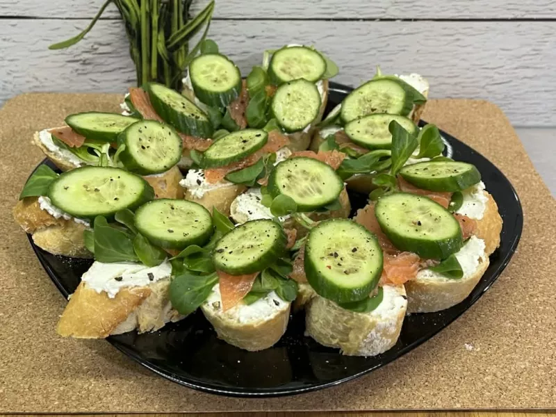 Te mini kanapeczki to elegancka i szybka w przygotowaniu przekąska, idealna na przyjęcia, spotkania rodzinne czy wieczory z przyjaciółmi. Kremowy serek śmietankowy doskonale komponuje się ze świeżym, wędzonym łososiem, a plasterek chrupiącego ogórka dodaje całości lekkości i orzeźwienia. Składniki Bagietka Serek śmietankowy Roszponka Łosoś wędzony Ogórek Sól Pieprz Wykonanie Bagietkę pokrój na kromki, każdą z nich posmaruj serkiem śmietankowym. Na każdej połóż kilka listków roszponki, kawałe...
