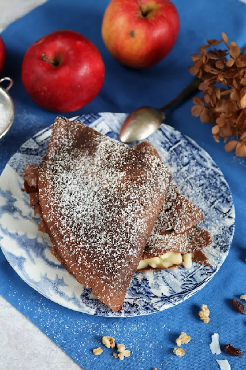 Naleśniki czekoladowe z smażonymi owocami.