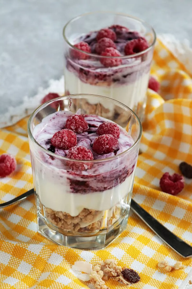 Pożywne śniadanie to podstawa każdego dnia. A oto moja propozycja na smakowicie słodkie śniadanko w dosłownie 5 minut. Składniki: (na 2 szklanki) 100 g musli 300 gr jogurtu naturalnego 2 łyżki miodu 2 łyżeczki dżemu jagodowego domowej roboty garść malin lub innych owoców Na samo dno wysypujemy musli, zalewamy jogurtem, dodajemy miód, dżem i owocowe. I gotowe! Szybkie i smaczne śniadanie w 5 minut gotowe. Dla smaczniejszego wyglądu górę można lekko wymieszać tworząc jogurt jagodowy :)