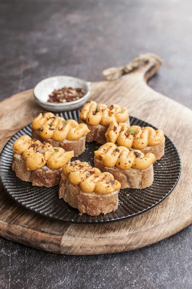 Pasta z fety z dynią z suszonymi pomidorami na grzance z orkiszowej bagietki na zakwasie.Można je posypać przyprawą kamisu pomidory z czosnkiem. Ja ją bardzo lubię, daje dużo smaku potrawom. Dodałam także listki i świeżego tymianku ale świetna będzie też bazylia czy rukola.Składniki:2 łyżki puree z dyni najlepiej hokkaido albo piżmowej 1 opakowanie fety 3 sztuki pomidorów suszonych 1 łyżeczka koncentratu pomidorowegoszczypta mielonej kolendry najlepiej utartej w moździerzupłatki chili przypra...