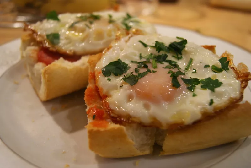 Pieczona bagietka z pastą pomidorową i jajkiem