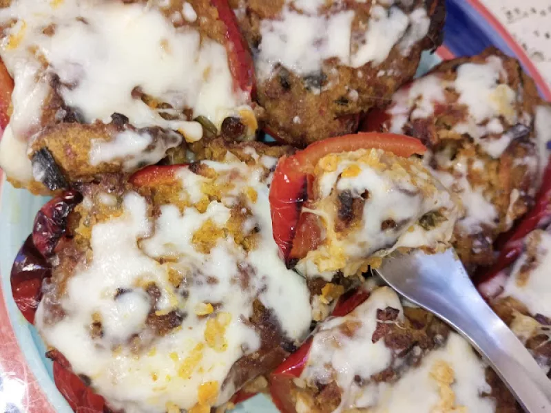 Składniki: papryka 4 sztuki średnie, olej rzepakowy 12 łyżek, cebula czerwona 1 sztuka, ząbki czosnku 8 sztuk, por 1 sztuka średni, marchew 3 sztuki większe, pomidory 3 sztuki miękkie ryż ugotowany 100 gram woreczek, pieprz ziołowy 2 łyżeczki, papryka ostra 1 łyżeczka, sól i maggi do smaku, jajka 1 sztuka "L", bułka tarta 1/2 szklanki Ryż ugotować bez soli, wystudzić woreczek, papryki przekroić wzdłuż na połowę, oczyścić, opłukać. Na oleju podsmażyć pokrojone drobno cebulę, czosnek, por, marc...