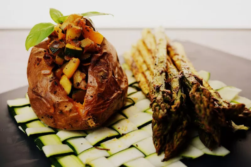 Pieczone bataty nadziewane warzywami podane z grillowanymi szparagami