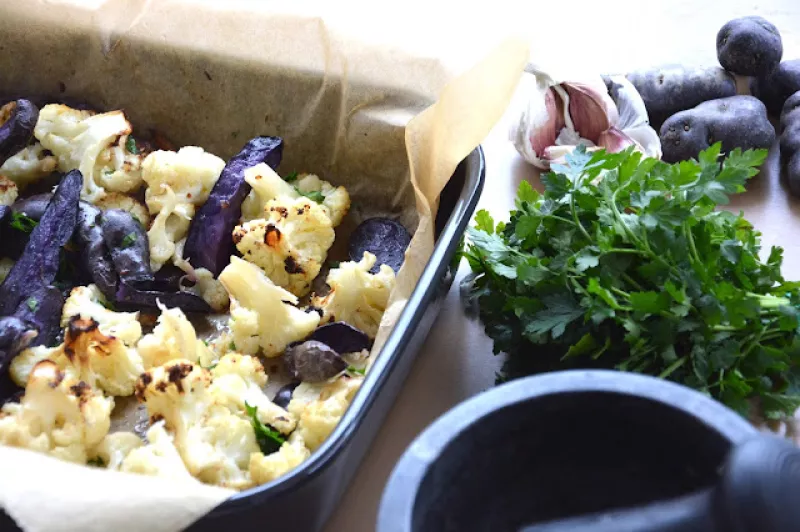 Składniki połowa kalafiora ok 6 fioletowych ziemniaków ("chińskich trufli") 5-6 ząbków czosnku posiekana natka pietruszki dobry olej/oliwa dobra sól, swieżo zmielony pieprz, płatki chilli Przygotowanie Czosnek obierzcie, wrzućcie do moździerza, posypcie solą i rozgniećcie na pastę. Odstawcie na kilka minut. W międzyczasie tak zwanym wyszorujcie ziemniaki, kalafiora umyjcie i podzielcie na różyczki. Nagrzejcie piekarnik do 200 st, przygotujcie naczynie do pieczenia. Rozgnieciony czosnek wymies...